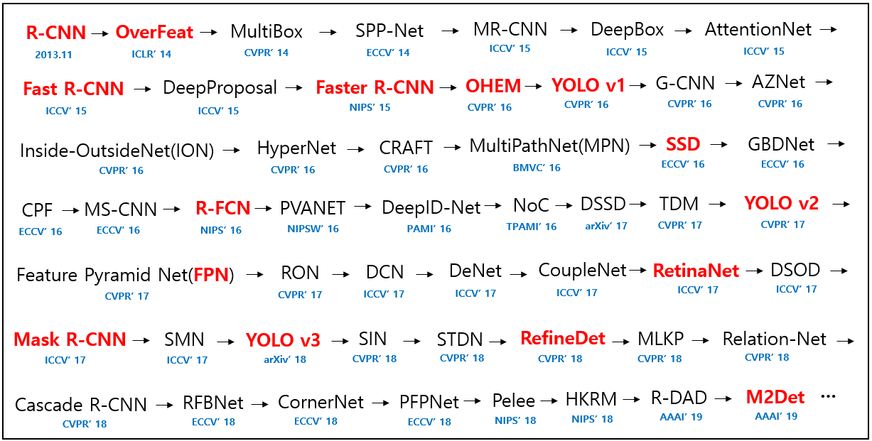 앞으로 Object Detection 문제를 해결하기 위해 개발되어 온 딥러닝 기반의 모델들을 앞으로 하나씩 살펴보려고 한다. 친절하게도 Hoya012 님께서 친절하게 시간 순으로 논문으로 발표된 딥러닝 기반의 Object Detection Architecture를 그림으로 정리해 주셨다. 여기서 빨간색으로 처리된 것들은 핵심 Architecture로 꼭 이해하고 가는 것이 좋다고 한다.
