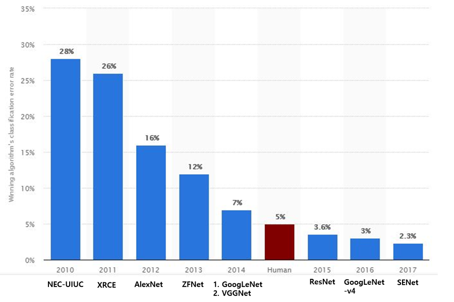 (엄밀하게 말하자면 ImageNet 데이터 셋에 대해 사람보다 잘 인식한다는 것이지 모든 물체를 사람보다 잘 인식한다는 말은 절대 아니다 ㅎ)