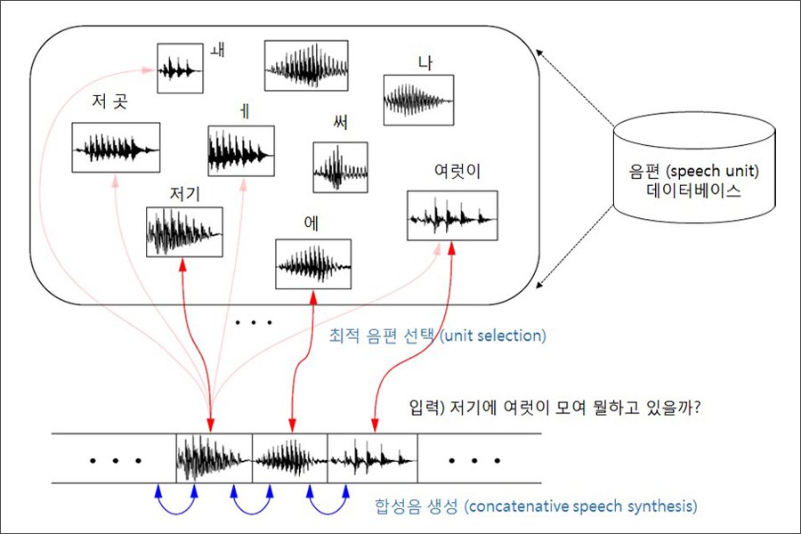 초창기 연구 방식인 것 같은 연결 방식은 Unit Selection Synthesis라고도 불린다. 말 그대로 입력에 대응하는 값을 선택(selection)하여 음성을 합성화는 연구 방식이다. 이를 위해 소리를 음편(Speech unit)이라는 가장 작은 단위로 분해해서 데이터베이스에 저장한다. 연결 방식의 음성 합성은 가장 간단하지만 모든 입력에 대응하는 음편이 DB에 있어야 합성이 가능하며 음편마다 소리의 톤이 다르다면 합성 음성이 부자연스러울 수 있다는 단점이 있다.