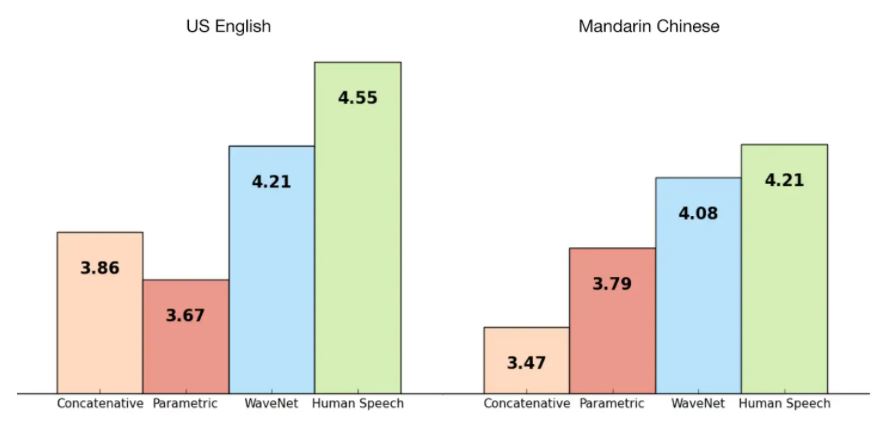 여기서 수치 값은 Mean Opinion Score(MOS) 평가 값이며 정성적인 평가 방법으로 음성 합성 분야에 사용되는 대표정인 평가 방법이다. MOS 평가 방법은 사람이 원본 음성을 포함한 합성된 음성을 임의로 들으며(blind test) 얼마나 자연스러운 음성인지에 대한 정도를 1~5 사이의 정수 값으로 평가한다. 최종적으로 이를 평균내어 계산하면 MOS 값이 된다. WaveNet 논문에서는 평가를 위해 학습에 사용되지 않은 100개의 테스트 문장을 추출하였고 총 500개의 평가 데이터로 MOS 값을 계산하였다고 한다.