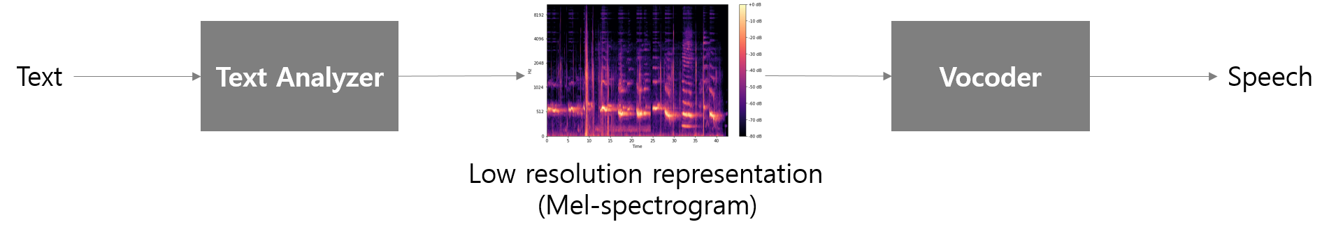 - Text Analyzer : 입력 Text로부터 Mel-spectrogram과 같은 Low resolution representation을 예측