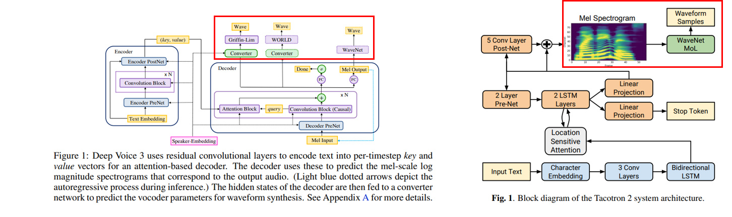 위 그림은 TTS 모델에 해당하는 Deep Voice3 [2]와 Tacotron2 [3]의 구조도이다. 입력 텍스트로부터 합성 음성을 만들어내는 과정이며 이 중 빨간색 박스로 지정한 부분이 Vocoder 영역에 해당한다.