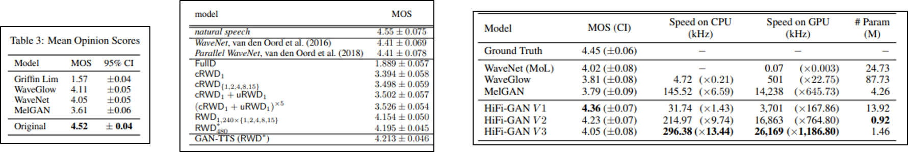 위 성능 표에서 확인할 수 있듯이 MelGAN과 GAN-TTS같이 GAN 모델의 경우 기존의 방법들에 비해 MOS 값이 상대적으로 낮다. 하지만 속도나 파라미터 개수 부분에서 효율적으로 개선이 되었고 또 최근에 카카오에서 발표한 HiFi-GAN 모델의 경우에는 합성 음성의 퀄리티 부분에서도 개선을 보이며 기존의 방법들보다 높은 MOS 값을 가지며 세 마리 토끼를 동시에 잡았다고 한다.