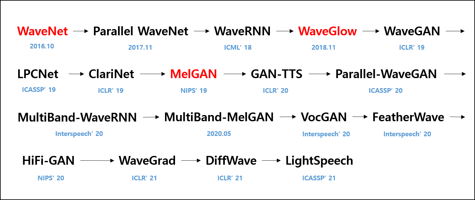 예전에 object detection 모델에 대한 공부를 하면서 hoya님의 정리 내용을 인상깊게 보고 배워서 나도 이번에 다른 사람들에게 도움이 되고자 Neural Vocoder 모델을 정리해 보았다. 학회의 순서까지 고려하지는 못했지만 전반적인 흐름을 익히는 데 참고하셨으면 좋겠다. 빨간색으로 표시한 모델들은 Neural Vocoder의 대표적인 모델로 공부하실 때 꼭 보면 좋을 것 같다.