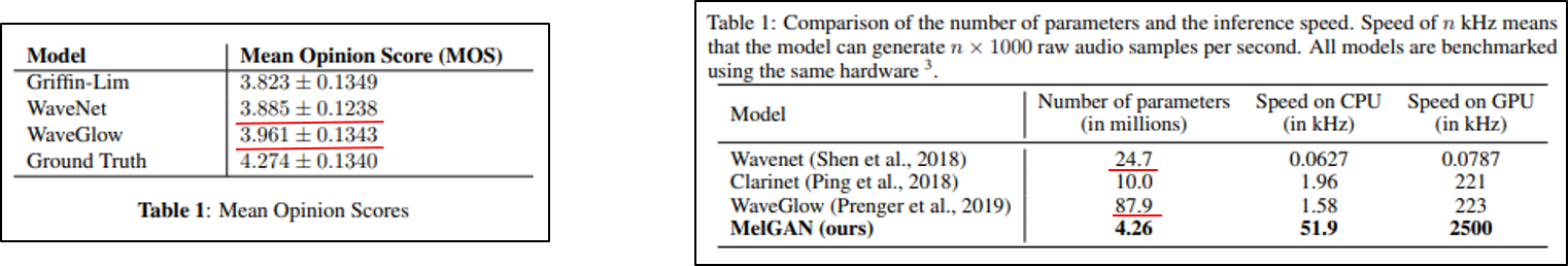 위 그림처럼 Flow-based 모델인 WaveGlow 모델은 WaveNet보다 높은 MOS 점수를 받으며 합성 음성의 퀄리티가 좋다는 것을 확인할 수 있지만, MelGAN 논문에서 보이는 것처럼 WaveGlow 모델의 파라미터 개수는 WaveNet에 비해 4배 보다 조금 안될 정도로 많다는 것을 확인할 수 있다.