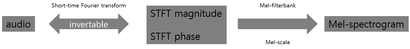 Mel-spectrogram에서 audio를 예측하는 부분을 조금 더 설명하자면, 원래 audio를 mel-spectrogram으로 변환하는 과정은 다음과 같다.