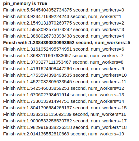 num_workers가 몇 개가 적당한지에 대한 정답은 없다. 학습 환경의 GPU, CPU개수, I/O속도, 메모리 등과 같이 다양한 조건에 따라 최적의 값이 다르다고 한다. 아래 사진처럼 어떤 사람의 학습 환경에서는 num_workers가 5일 때 최적이지만 다른 사람의 환경에서는 다를 수 있다.