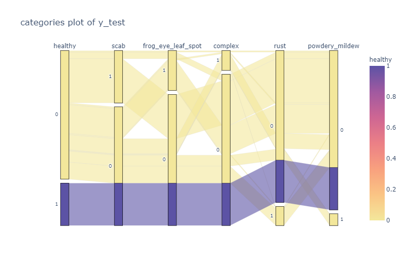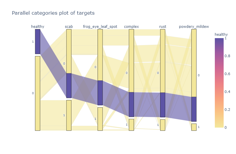이를 plotly 라이브러리를 이용해 시각화하면 아래처럼 데이터의 분포를 파악할 수 있다. 간략하게 그림을 설명하자면 각 label별로 1, 0을 갖는 데이터의 분포를 막대로 표현하였고 파란색 연결선 처럼 ['healthy', 'scab', 'frog_eye_leaf_spot', 'complex', 'rust', 'powdery_mildew'] = [1, 0, 0, 0, 0, 0]인 데이터의 개수가 많을 수록 두껍게 표현하였다.