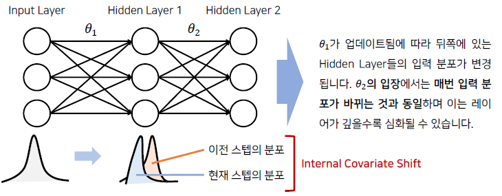 위에서 언급한 Covariate Shift(공변량 변화)가 뉴럴 네트워크 내부에서 일어나는 현상을 Internal Covariate Shift라고 한다. 즉, 매 스텝마다 hidden layer에 입력으로 들어오는 데이터의 분포가 달라지는 것을 의미하며 Internal Covariate Shift는 layer가 깊을수록 심화될 수 있다. (나동빈님의 강의를 참고하였습니다.)